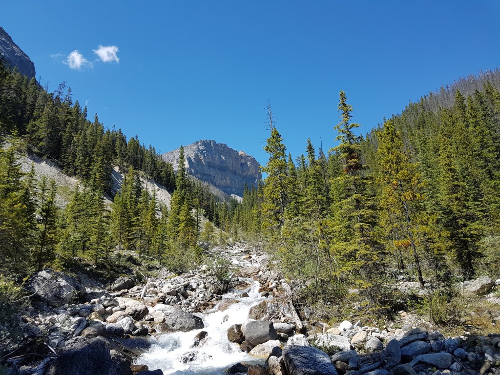 We packed up our vehicle at Bow Lake, had a quick lunch, and then north on the Icefields parkway and then took the exit onto David Thompson Highway at Saskatchewan Crossing. From here it was a quick 10-minute drive to get to the trailhead. We parked Victoria’s Jeep in the ditch beside Thompson’s Creek, opposite a campground by the same name. There is an obvious (but unmarked) trail right of the creek, which we followed through a lovely forest and mostly follows the creek. The trip report on theoutbound.com is what we followed and was fairly useful in following the unmarked trail, so I’ll just quote it here: