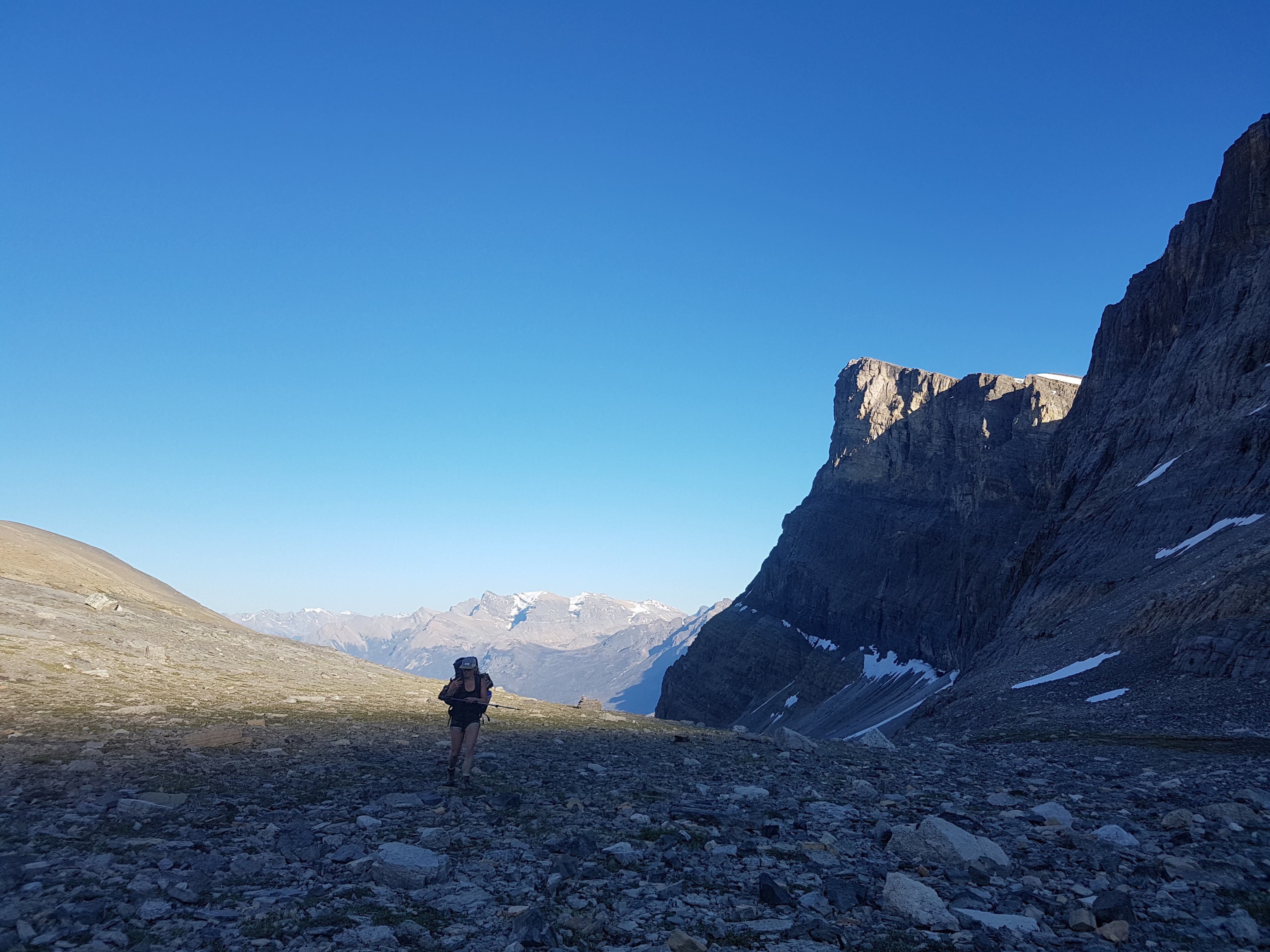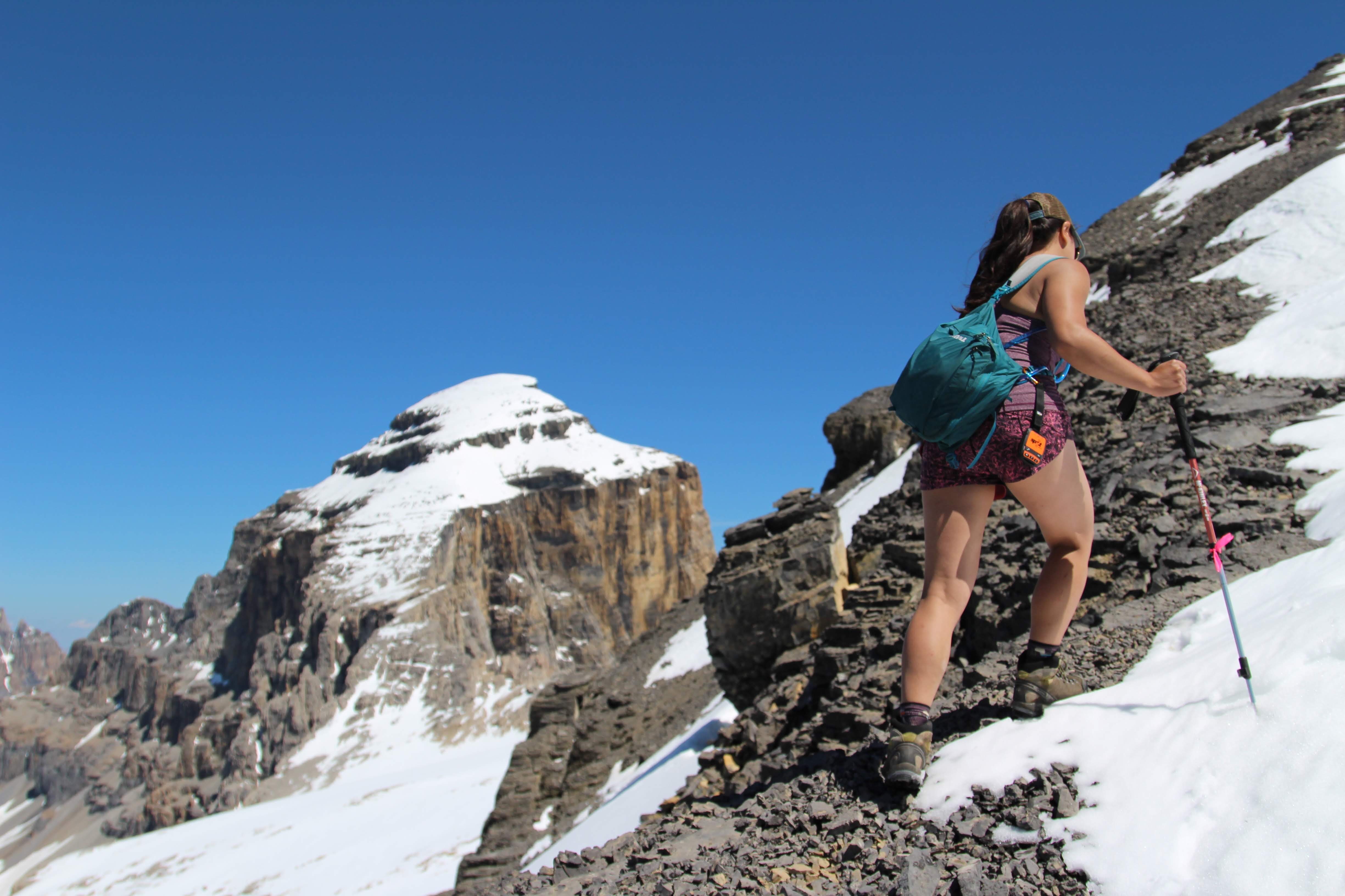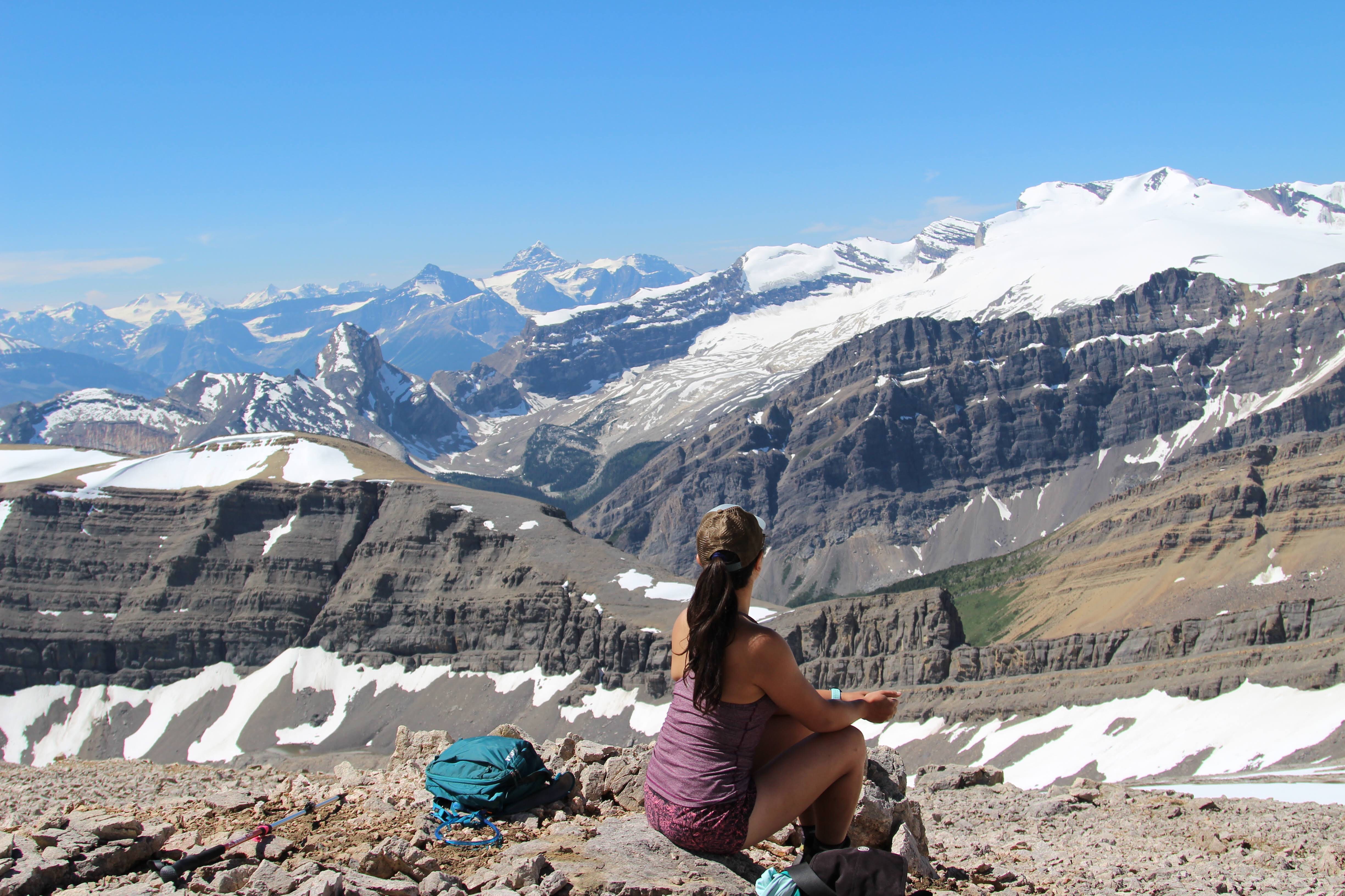 The next morning, since we didn’t plan on summiting Cline, we slept in and took our time making breakfast (muesli) and enjoyed a coffee. We then decided to scout out the route to Mount Cline (for future reference!) and explore the area a bit. At the very back of the two lakes there is a large headwall, which we easily scrambled up. At the top of this headwall we were treated with a stunning birds eye view of the lakes. Above the headwall, there was a long slope spotted with snow patches and trickling streams that lead to a glaciated col between two subpeaks of Cline. It was at this point that we opted to stay right and ascend the peak to the right of the col. It was a steady grind up loose scree to ascend this subpeak (which I believe is Mount Owen). When we reached the summit, we were treated to a gorgeous view of Mount Cline to the North, and many beautiful peaks on the Icefields Parkway to the West.
