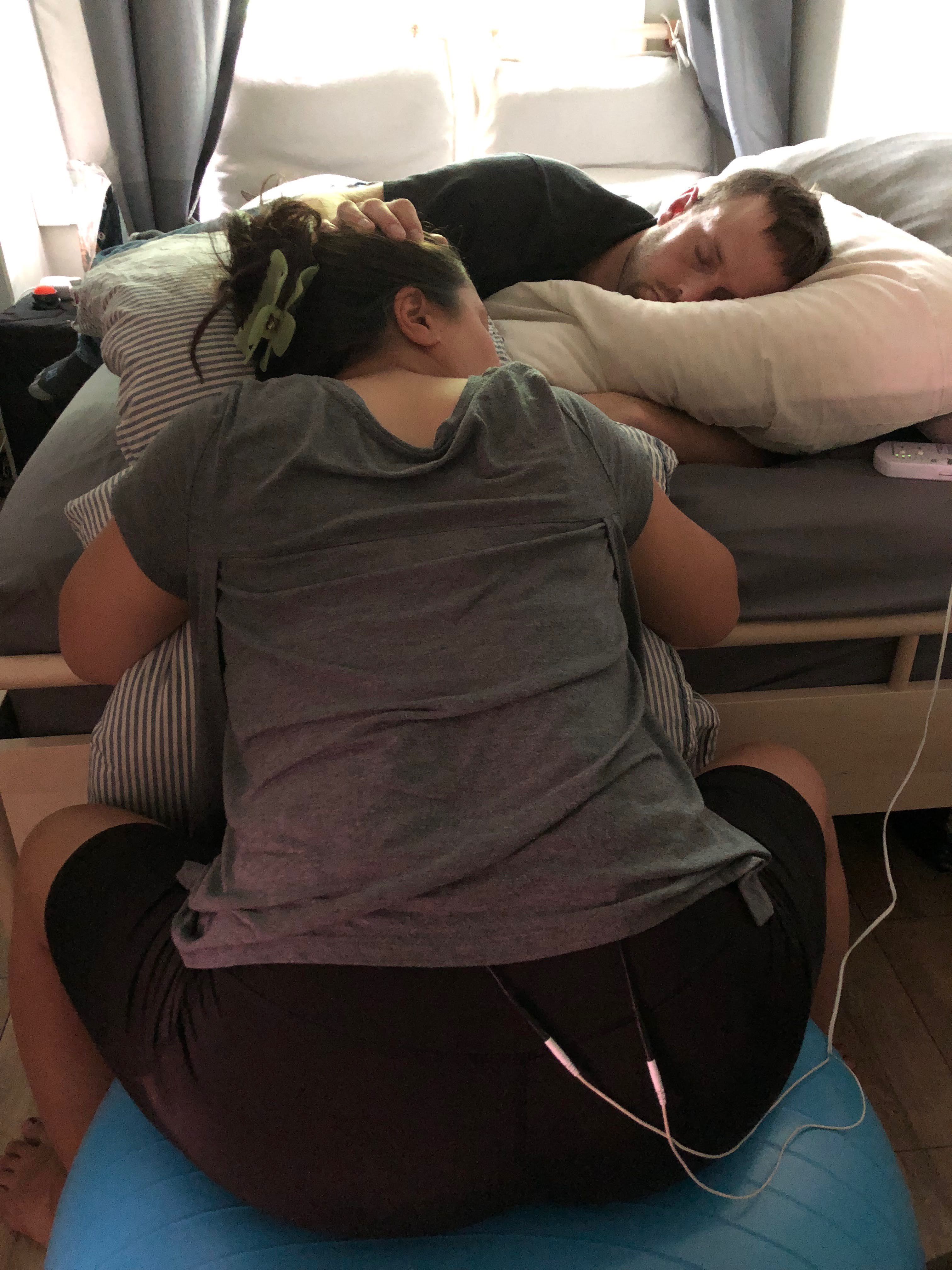 At the hospital, the doctor checked my cervix and we found out that despite the my contracts occurring every 4-5 minutes, I was only around 2-3 cm dilated and that we should go home and let things progress more before returning to the hospital. Needless to say I was extremely disappointed and on the verge of tears upon hearing the news. The doctor tried to provide some comfort and optimism, letting us know that even though my cervix wasn’t dilated much, I was already almost fully effaced (meaning my cervix had thinned enough for the baby to be born). We drove back home, but all the excitement of going to and from the hospital threw off the rhythm of my contractions and the progression of my labour actually slowed down. I remembered in Ina May’s book, she talks about how dilation can not only stall but in fact regress due to anxiety or stress factors, so it could have been the case that I was more dilated before going to the hospital when the contractions were strong. In any case, the slowdown was perhaps a mini blessing as I was able to squeeze in a short a nap with Ryan and recover some energy (I use the word “nap” very loosely! I was sleeping in 6-7 minute bursts between contractions).