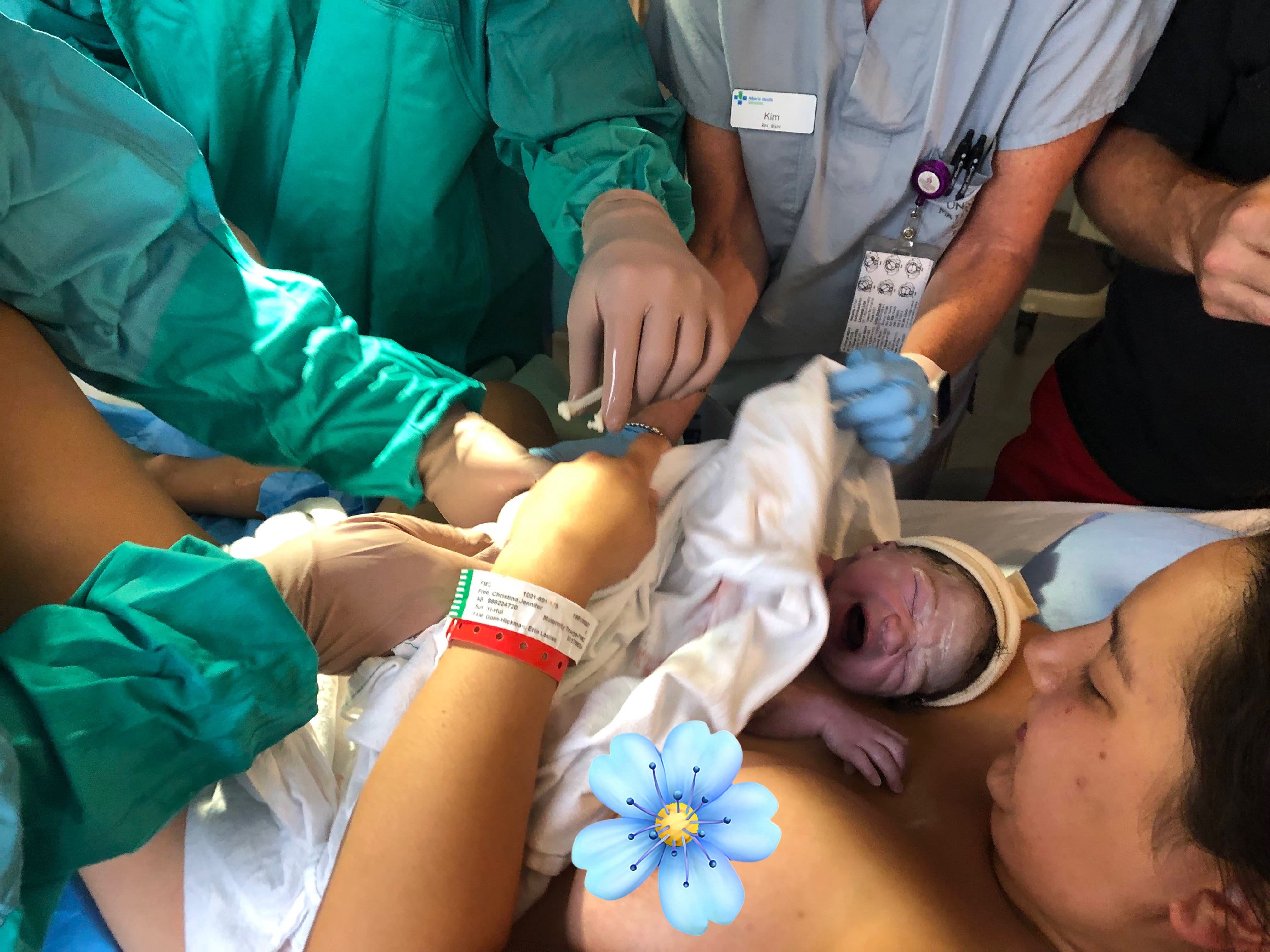 Dr. Jantzie excitedly told me that they could see my baby’s head and that there was a full head of hair! She suggest that I could reach down and touch baby’s head and feel how hard I should push by feeling the head come out further. I was actually touching my baby’s head for the first time and could feel the wet hair on their head! It was super effective to feel how his head would move in and out based on my pushing and before I knew it, after around 20 minutes, with a big push the entire head popped out and the rest of baby’s body slid easily through. I couldn’t see what was happening but Ryan told me it was like front row seats at sea world as baby, blood and fluid came rushing out of my body!