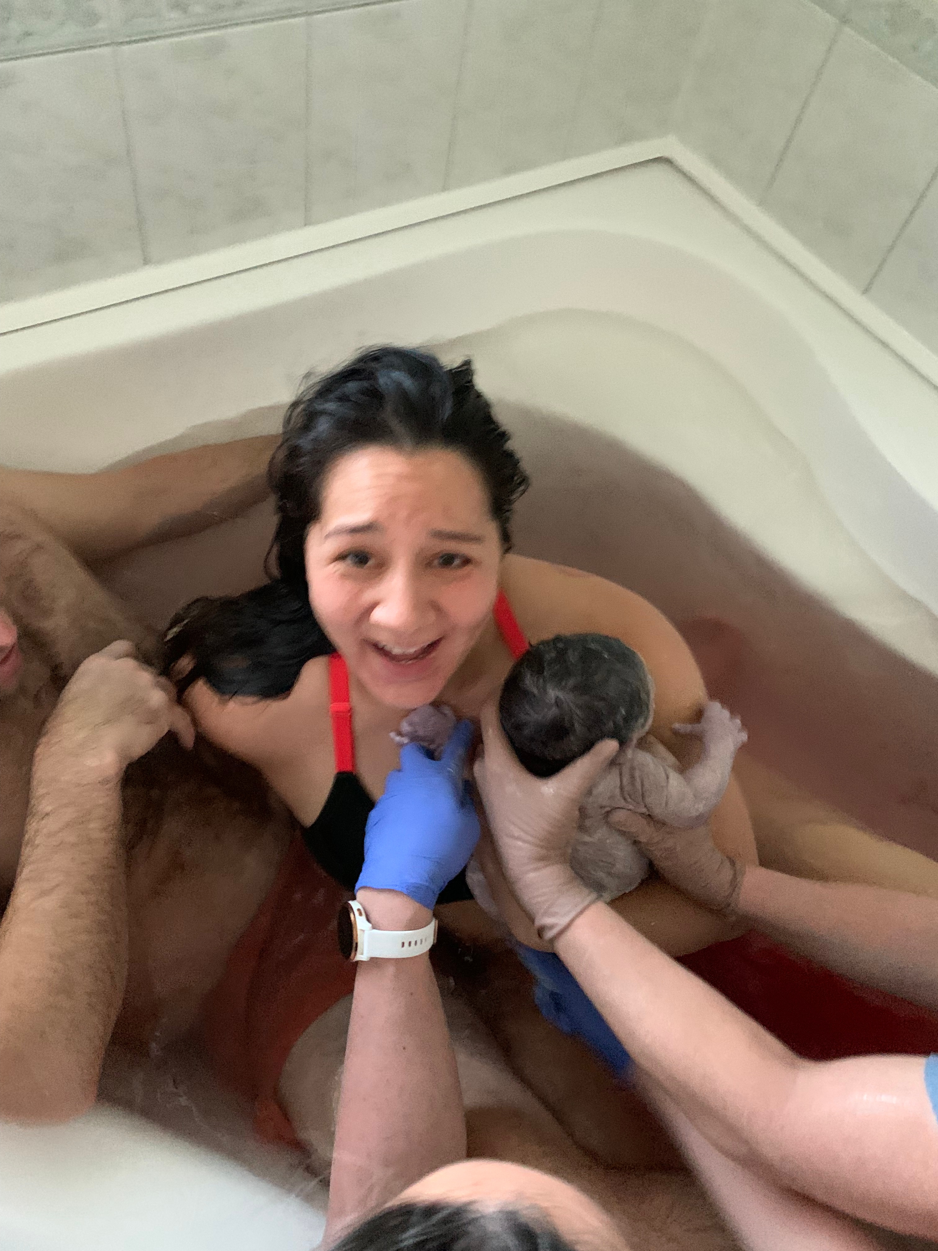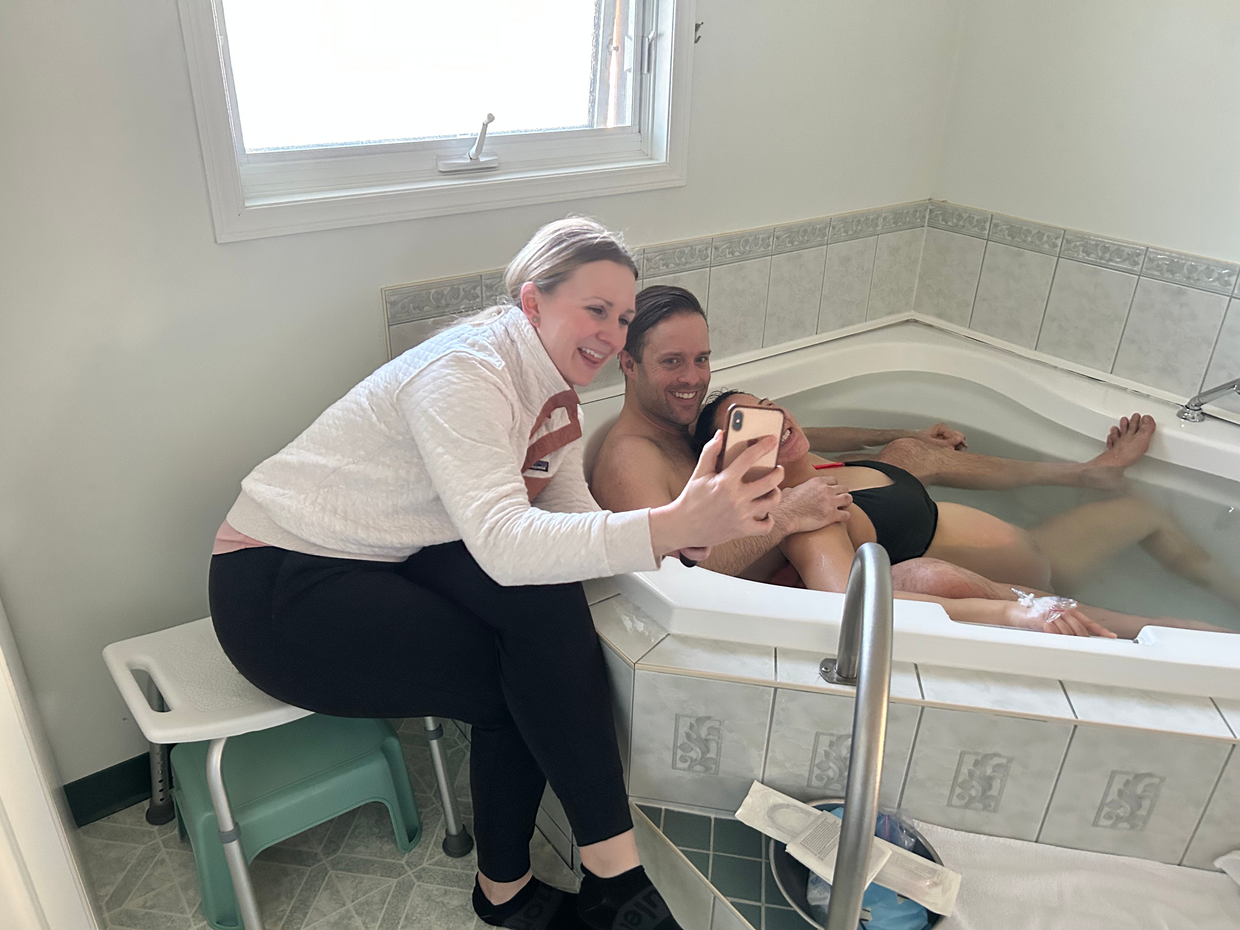 Tessi’s back up, another labour and delivery nurse, and Amy had both shown up by now as well – and just in time! Somehow between contractions I was able to relish the break and take brief moments to relax and lay back in the tub on Ryan’s chest as he held and supported me. Amy brought me some Vitamin water and helped me drink and stay hydrated between contractions. The entire atmosphere was really calm and joyful. Everyone was just so excited and happy that baby was on their way, and that my labour was progressing so smoothly. I was surrounded by three amazing health care professionals who were fully supportive of me and my birth plan – they filled my cup with words of affirmation and encouragement through the entire process. I was mostly just left to do my own thing – there was no fussing about or need to check my cervix. Occasionally between a contraction Tessi or the nurse would quietly and quickly check the baby’s heart rate to make sure they were still doing good. It really felt like me and my baby were in this journey together, doing exactly what we were meant to do, surrounded by incredible loving, kind and people who had full trust in me and my strength and ability to have this baby.