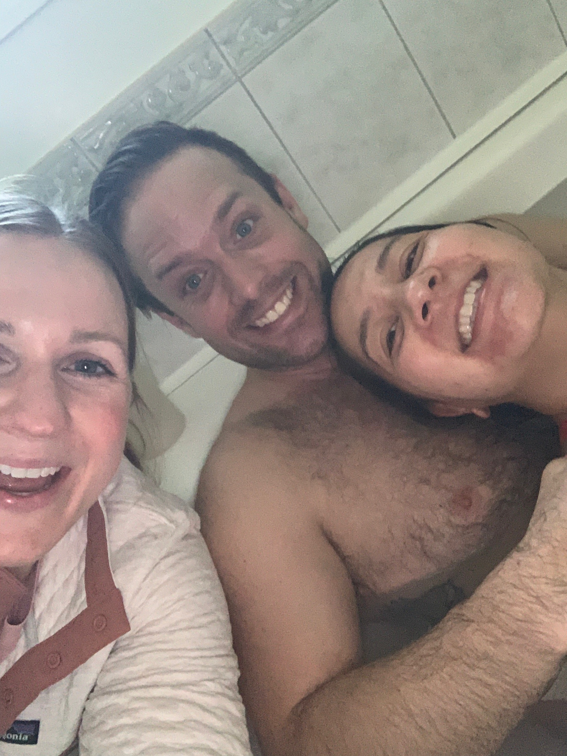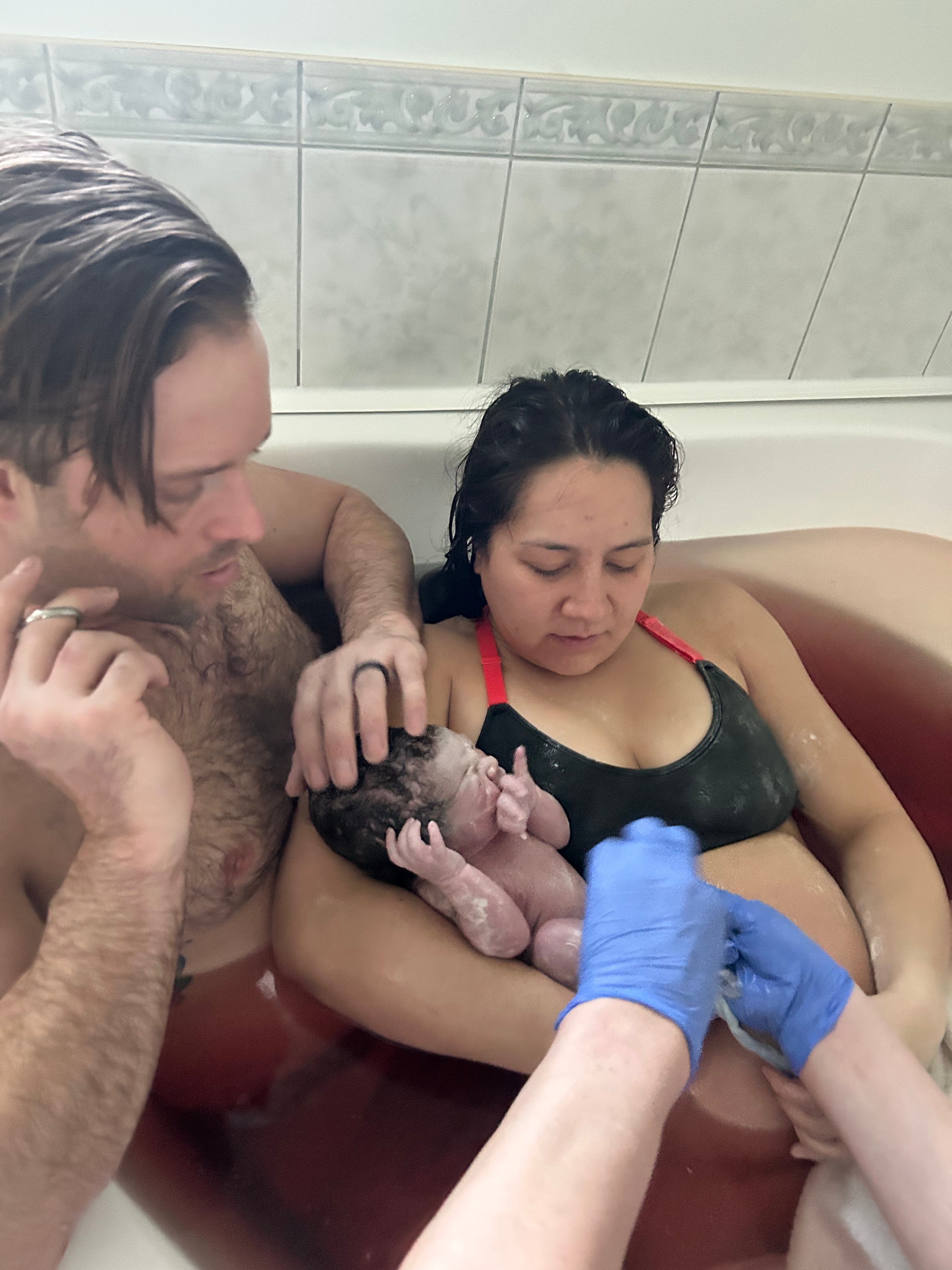 My low moans and groans started to become full on guttural war cries as I could feel the need to start to push during my contractions. Tessi encouraged me to reach down to see if I could feel the head of the baby and I could! My baby was almost ready to come out into the world! Due to her needing to have access to catch the baby, I had to try to reposition my labouring position from my kneeling forward lean. I tried to lay back onto Ryan but it was far too uncomfortable on my low back. I ended up in a side lying position in the tub for pushing, leaning into Ryans and I held onto his strong arms for support. Of course Ryan let squeeze his biceps into pulp while I pushed, and he didn’t complain at all!