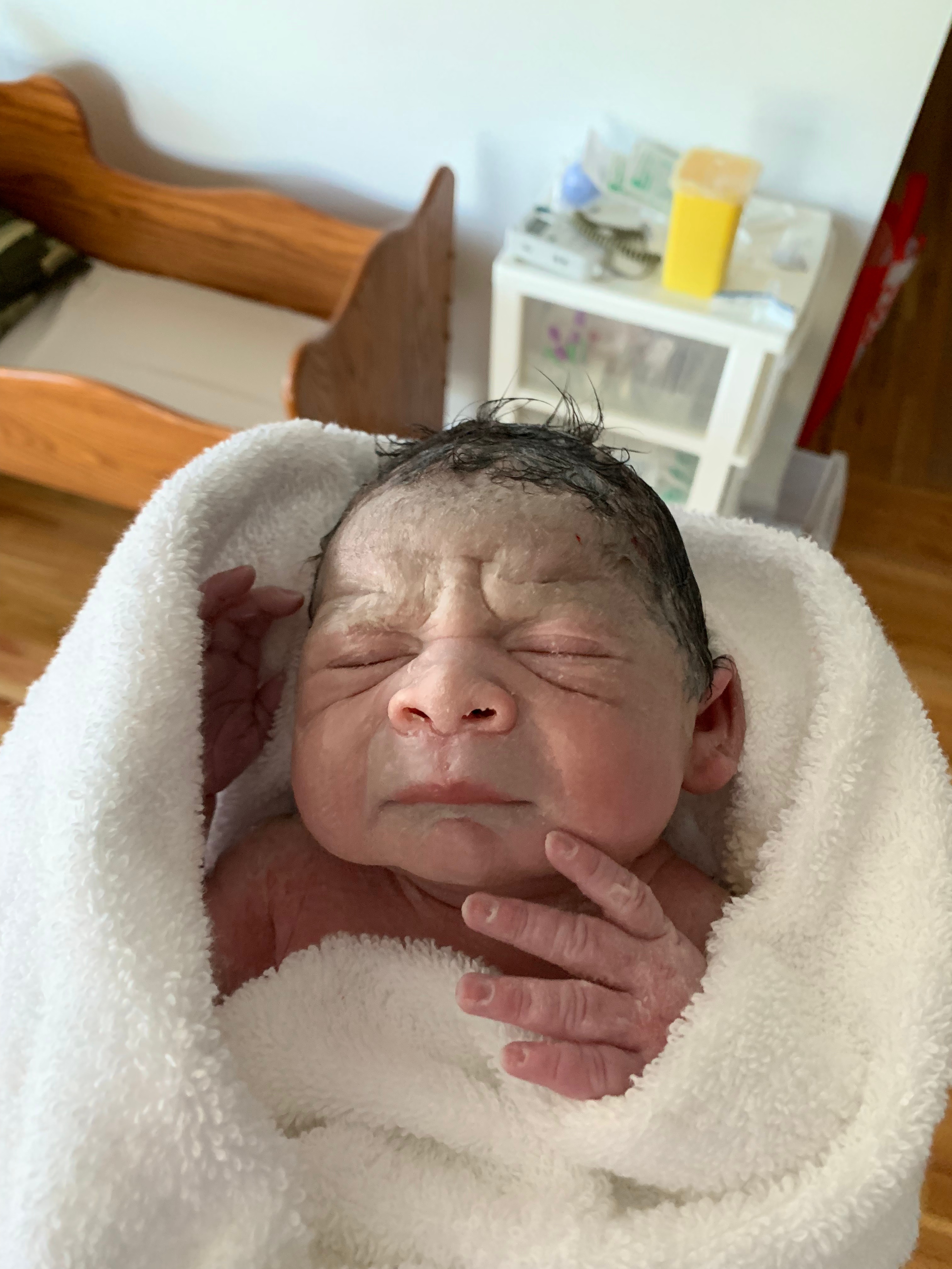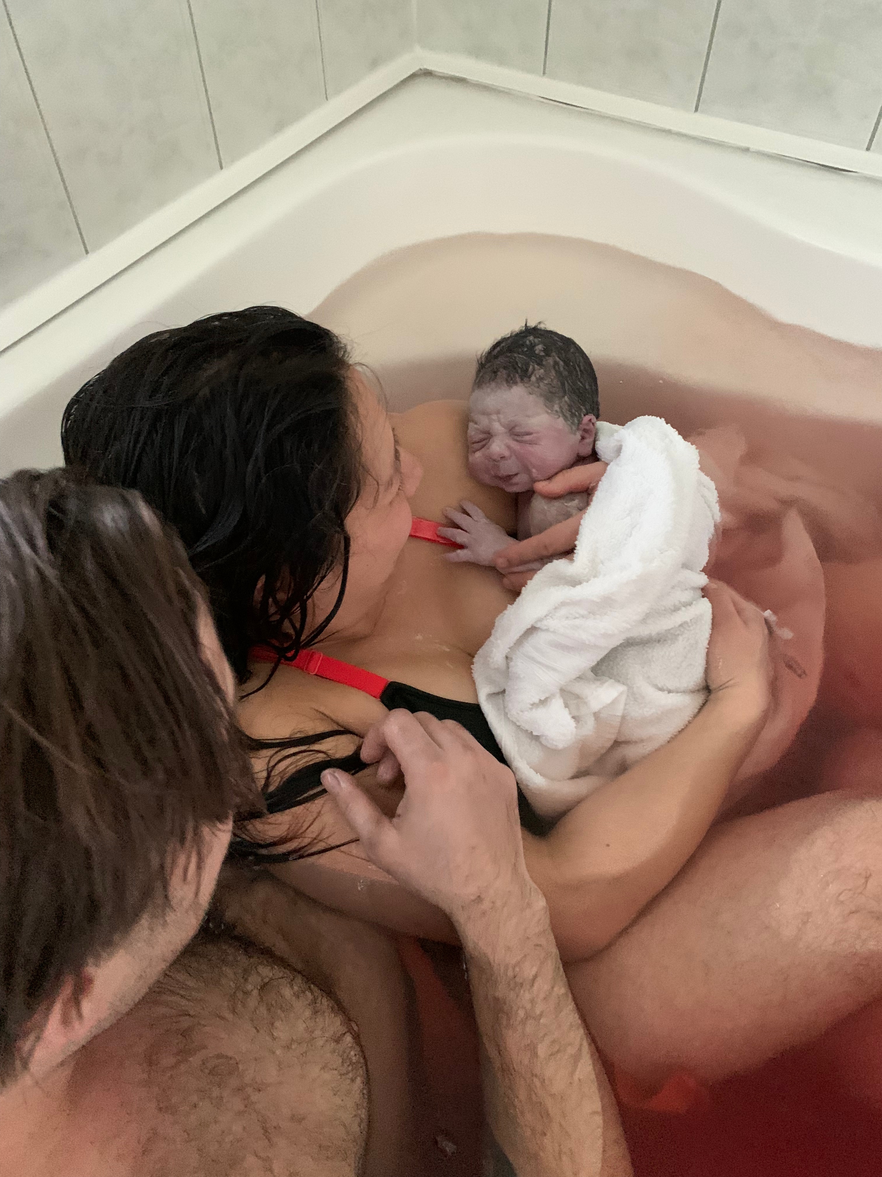 I only had a couple rounds of pushing before the little head popped out, I had a extremely brief break between contractions to gather my strength, and then the next contraction Tessi told me to “pant” the baby out. Essentially, instead of bearing down on the push, I would breathe the baby out with short shallow breaths to reduce the risk of tearing (which totally worked, I didn’t need any stitches after birth!). The rest of my baby’s body slid out into the water and Tessi lifted them out of the water, placed them onto my chest and draped a warm towel over us in the tub. We did it! A wave of serenity and relief washed over me and I held my child in my arms for the first time. I took a little peek under the towel – it was another boy! Augie got the little brother he was hoping for! Our sweet baby boy was born on March 19 at 7:06 PM – just a couple short hours after arriving at the birthing centre!
