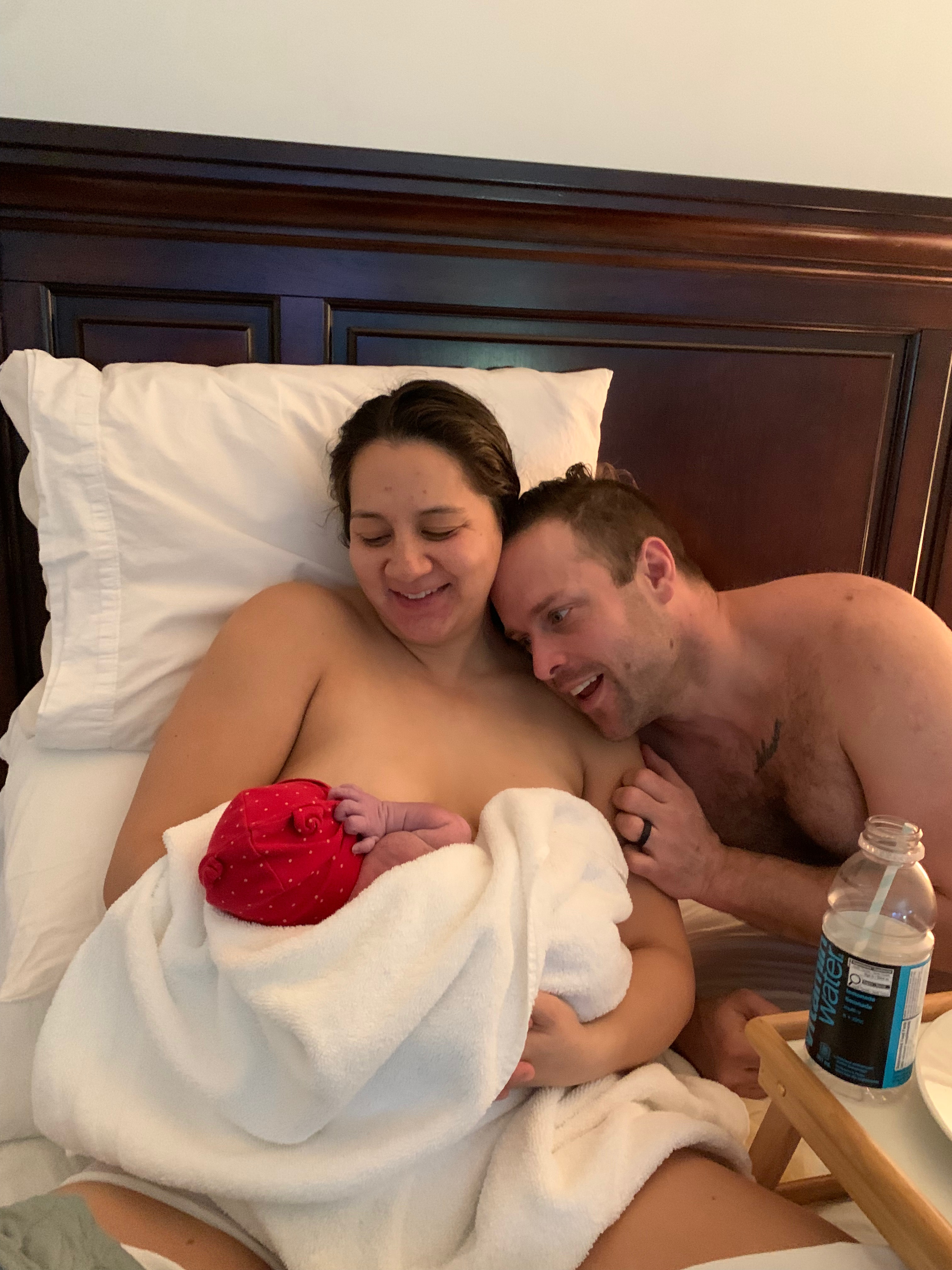 Ryan cut the umbilical cord while we were in the tub, and then I was helped out of the tub, dried off, and lay down to rest on the comfy bed in the main room. I delivered my placenta on the bed, and then our brand new baby boy was placed on my naked chest and we nestled together for the golden hour of skin-to-skin while Tessi and the nurse took down medical notes – I was pretty oblivious to what was going on as my focus and attention was fully on our new baby! Ryan lay in bed with us and we talked about what to name the newest member of our family. We decided fairly quickly on Robin – a name that we both love, but also, Ryan’s favourite bird, also the bird that we got matching tattoos of after we got married, and our baby was born on the most gorgeous, sunny spring day just hours before the official first day of spring!